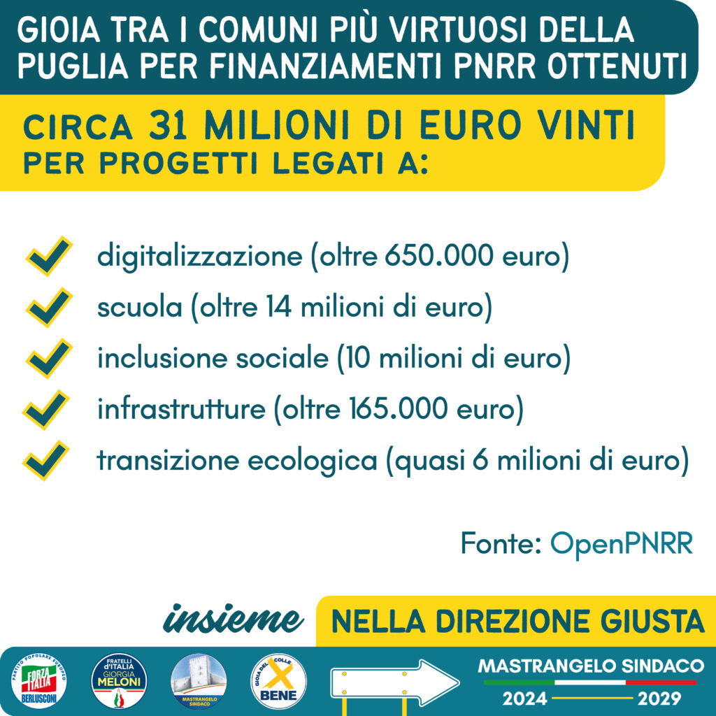 Gioia tra i comuni più virtuosi della Puglia per finanziamenti PNRR ottenuti!